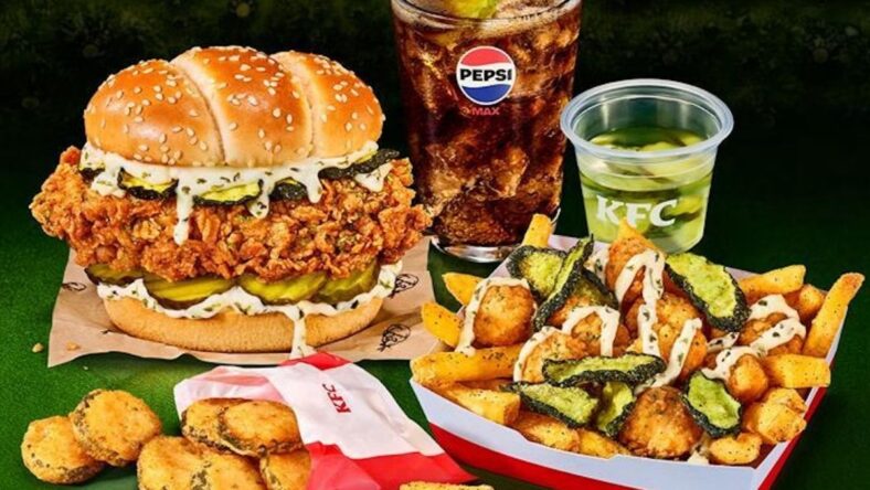 One of the top items is the Pickle Burger, which layers KFC’s Original Recipe chicken fillet with gherkins, pickle ranch sauce, crispy pickle chips, and pickle seasoning.